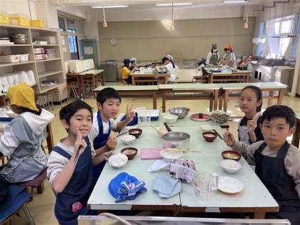 11月22日(金)、11月25日(月)の3,4時間目に各クラスで実習を行いました。お鍋でご飯を炊きながら、みそ汁を作る中で今何をすればいいのか班で考えながら行動していました。3回目の実習にして子供たちの「協力」の仕方に成長が見られました。