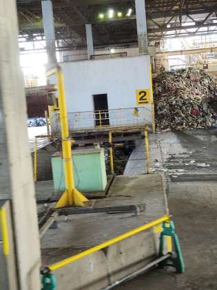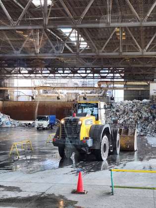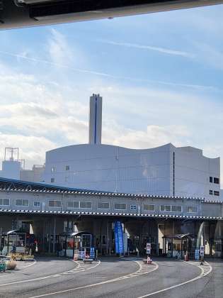 粗大ごみの破砕の様子をバスの中から見学しています。