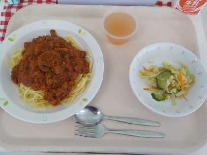本日の給食は、スパゲッティミートソース・オリーブドレッシングサラダ・アセロラゼリー・牛乳です。