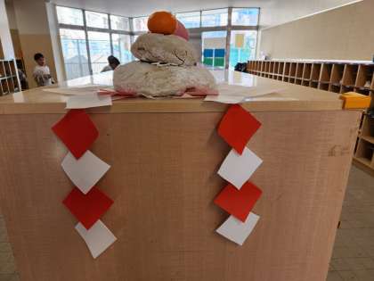 12月に行われたPTA主催の「もちつき大会」で、おやじの会の皆様についていただいた鏡もちを児童昇降口に飾らせていただきました。