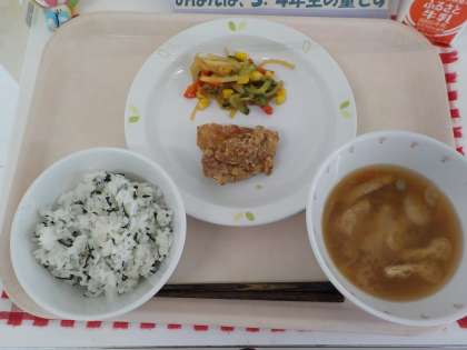 本日の給食は、わかめごはん・鶏肉のから揚げ・大根サラダ・味噌汁・牛乳です。