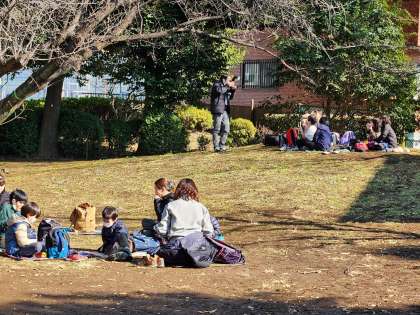 お弁当タイムです。みんな、笑顔で食べています。太陽があたり、暖かいです。