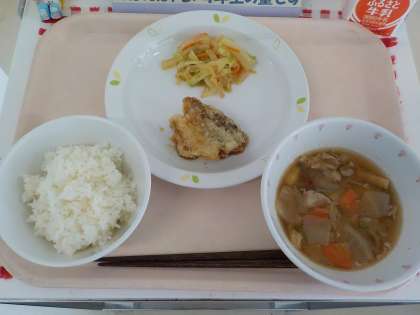 本日の給食は、ごはん・魚のあずまに・和風ドレッシングサラダ・豚汁・牛乳です。