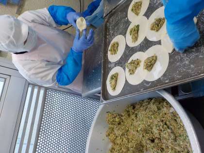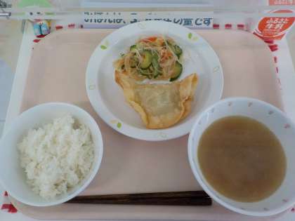 本日の給食は、有機米ごはん・ジャンボ餃子・バンサンスー・中華スープ・牛乳です。