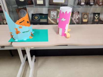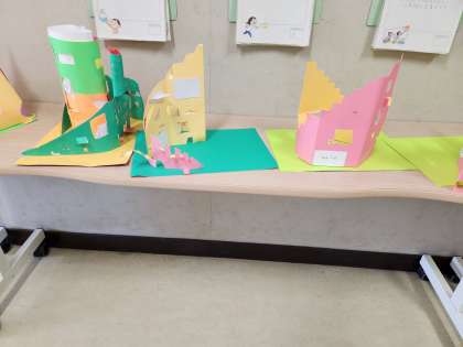 2年生 色が用紙をカッターで切り抜きながら作品を作りました。カッターの使い方の練習をしっかりしたので、上手に切り抜けています。