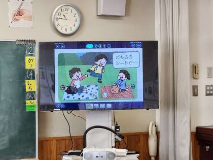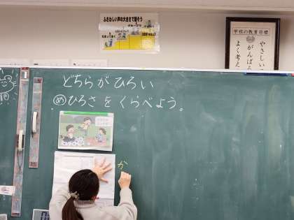 広さ調べの学習です。広さを比べるためにはどのようにするといいのかを考えます。