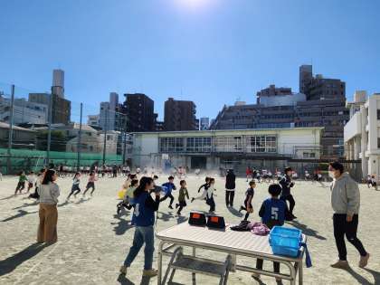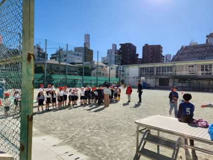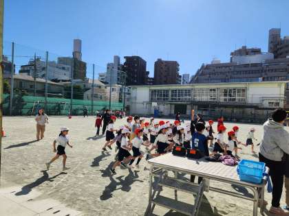 天気もよく、校庭を走ります。1年生は初めての経験です。