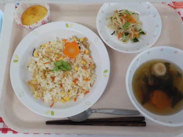 本日の給食は、ちらしずし・野菜のからしじょうゆ・すまし汁・桃のヨーグルトケーキ・牛乳です。