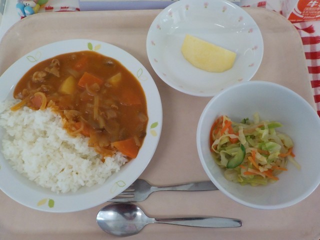 本日の給食は、ハッシュドポークライス・きゃべつと大根のサラダ・りんご・牛乳です。