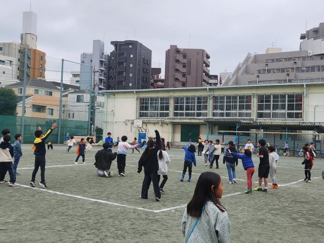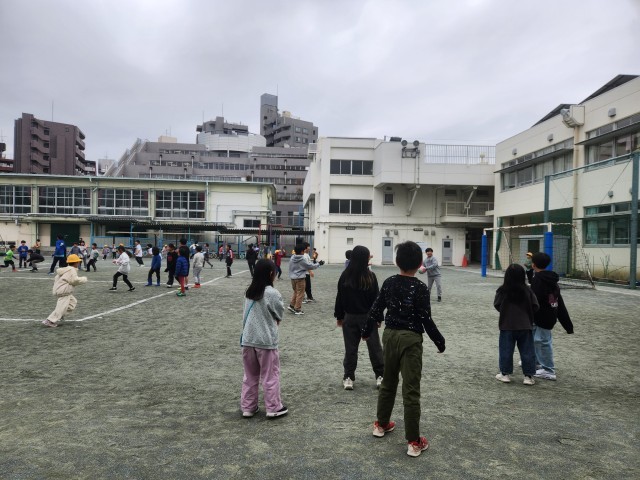 雪が降りそうな曇り空のなか、気温は低いですが、子どもたちは、元気いっぱい外遊びを楽しんでいます。