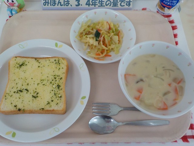 本日の給食は、ガーリックトースト・クリームシチュー・カラフルサラダ・ジョアです。