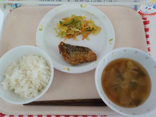 本日の給食は、有機米ごはん・魚の立田揚げ・キャベツのレモンじょうゆあえ・味噌汁・牛乳です。