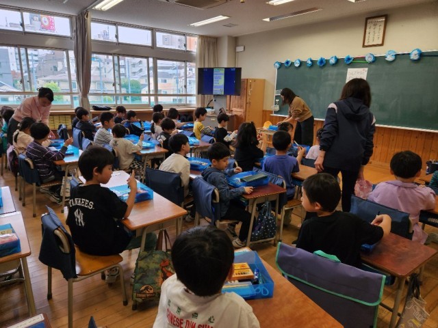 1年生の朝学習は、道具箱の整理整頓の仕方を練習しています。担任の話を落ち着いて聞いていました。