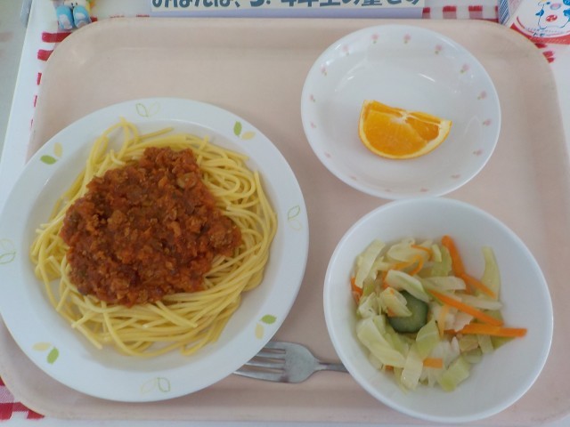 本日の給食は、スパゲティミートソース・野菜のイタリアンドレッシングあえ・清見オレンジ・牛乳です。