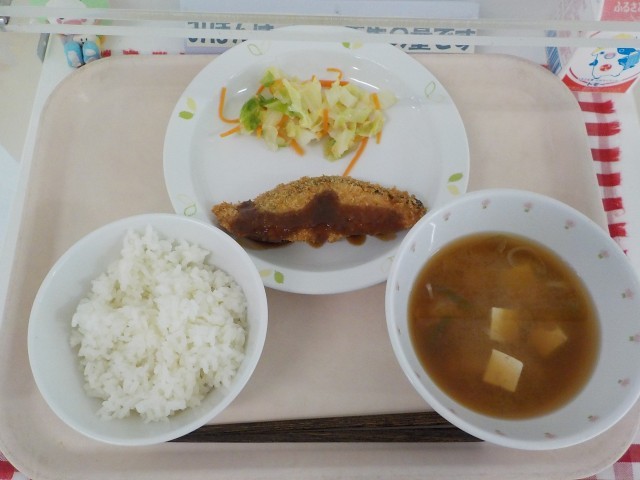 本日の給食は、ごはん・魚のフライ・キャベツとにんじんのサラダ・味噌汁・牛乳です。