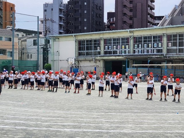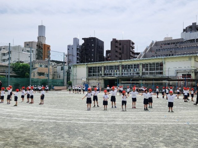 低学年が、校庭で動き方、自分の演技する場所を確認しています。2年生は上級生として、きびきびと活動しています。1年生は小学校の初めての表現活動ですが、ダンスの振り付けを覚えて、踊ることができています。