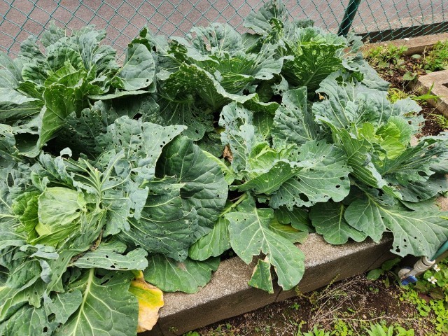 3年生の花壇には、キャベツを昨年度の末3月に植えました。立派なキャベツになりました。しかし、これは、栽培活動がねらいではなく、モンシロチョウの観察のために植えました。