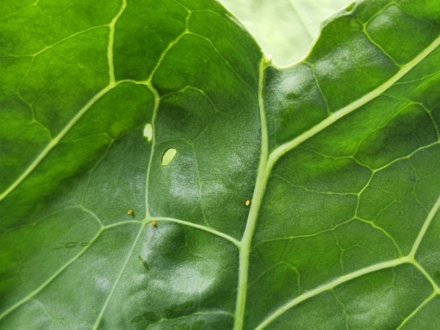 今年は、キャベツも大きく育ち、モンシロチョウのたまごもたくさん産み付けられました。