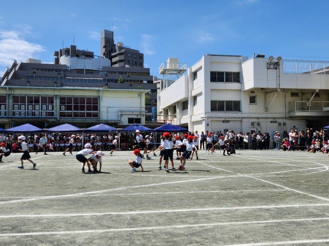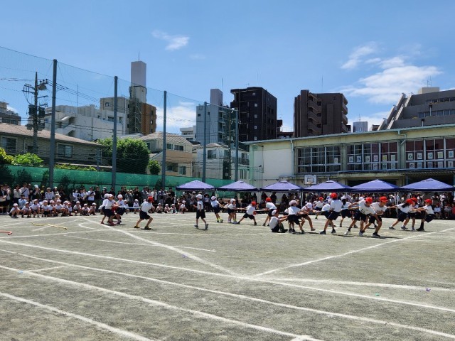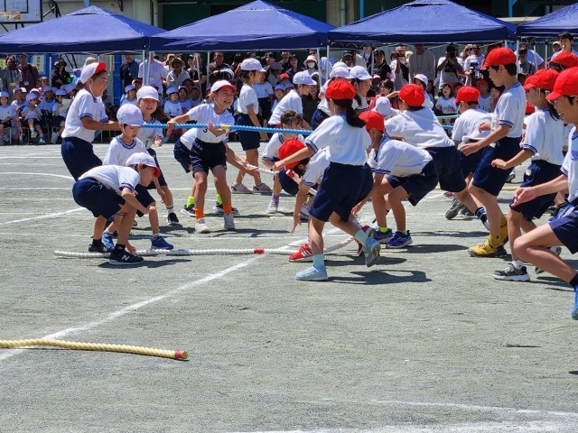 中学年の綱取りをしました。4回戦で行い、勝負します。陣地に引っ張ってきても安心できません。終わりの合図がなるまで、綱を引きます。