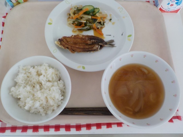 本日の給食は、麦ごはん・魚のかばやき風・和風サラダ・味噌汁・牛乳です。