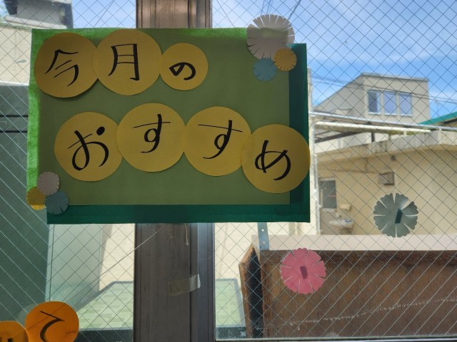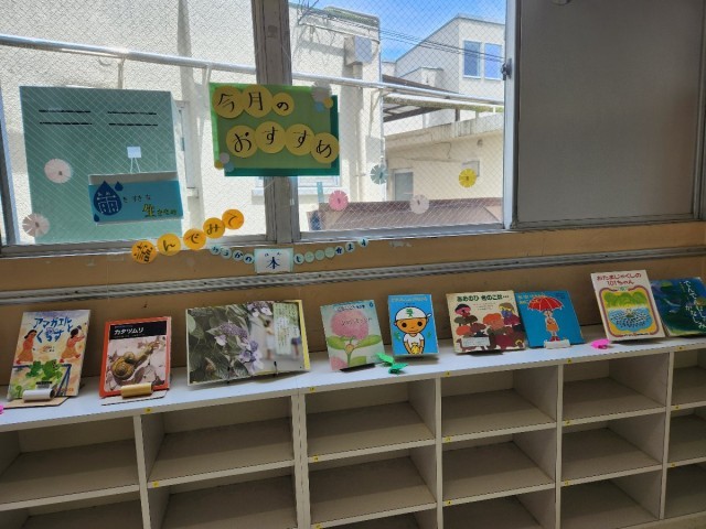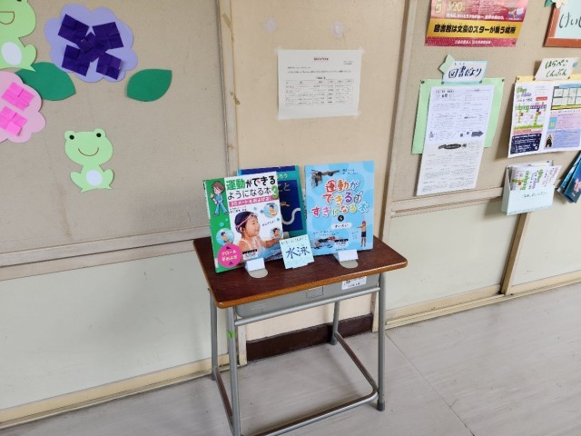 図書室の廊下には、6月のおすすめの本が展示してあります。