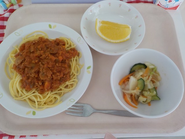 本日の給食は、スパゲッティミートソース・玉ねぎドレッシングサラダ・河内晩柑・牛乳です。