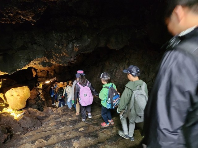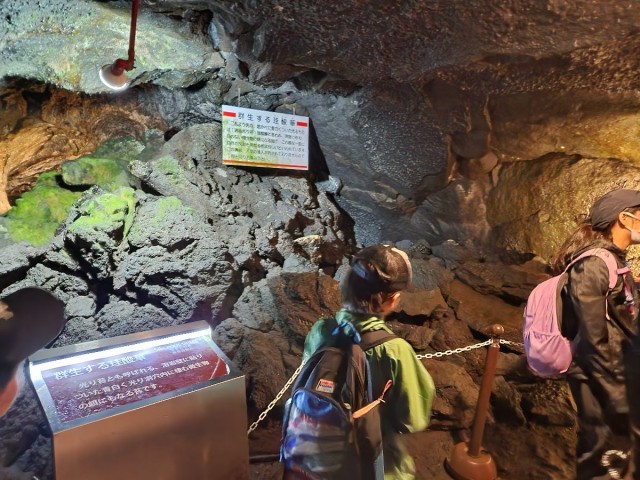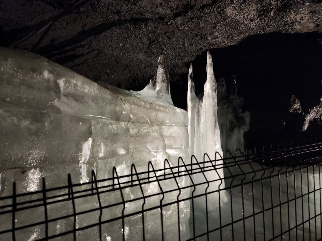 風穴の中、氷がたくさんありました。上から冷たい水がぽたりと落ちてきました。