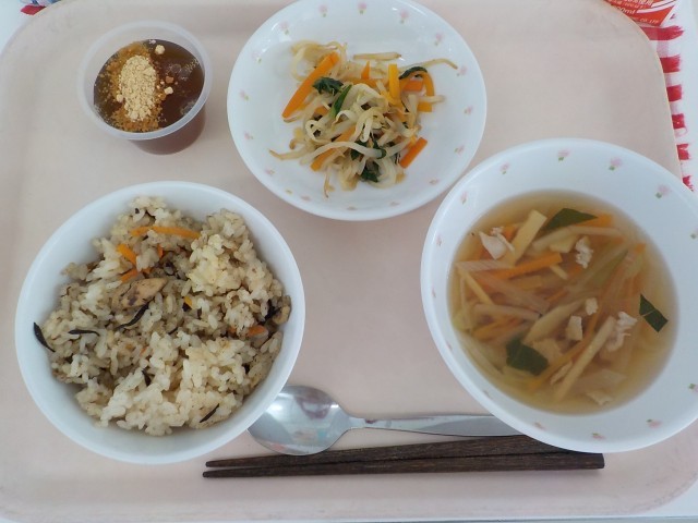 本日の給食は、ひじきごはん・野菜のおひたし・沢煮椀・黒蜜寒天・牛乳です。
