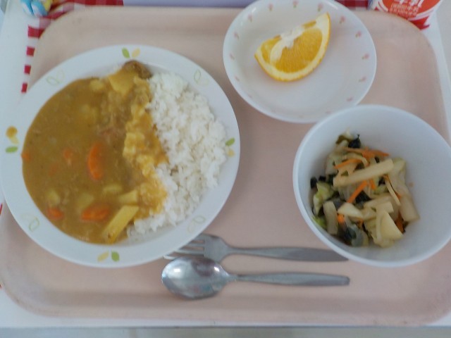 本日の給食は、三宿カレーライス・わかめサラダ・甘夏・牛乳です。
