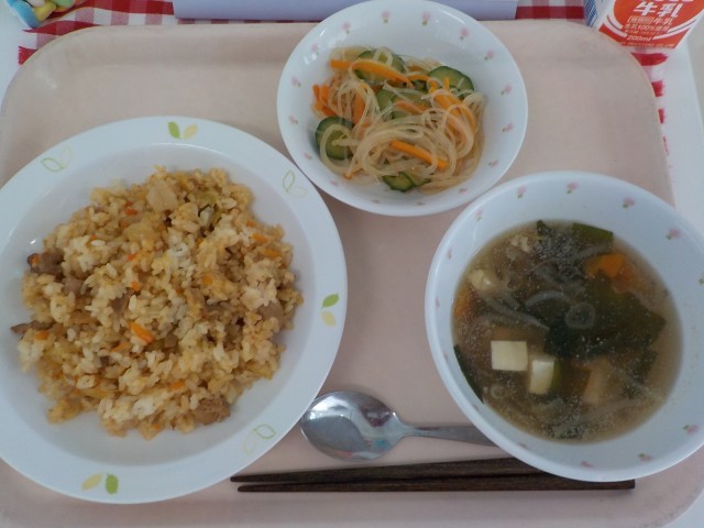 本日の給食は、キムチチャーハン・春雨サラダ・わかめスープ・牛乳です。