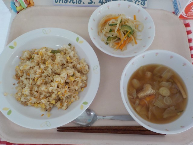 本日の給食は、そぼろごはん・やさいの梅ドレッシング・キャベツの味噌汁・牛乳です。