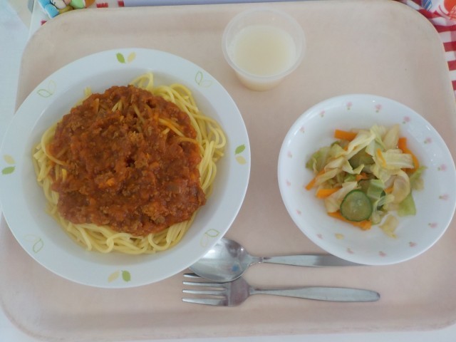 本日の給食は、なす入りミートソーススパゲッティ・オニオンドレッシングサラダ・ホワイトゼリー・牛乳です。