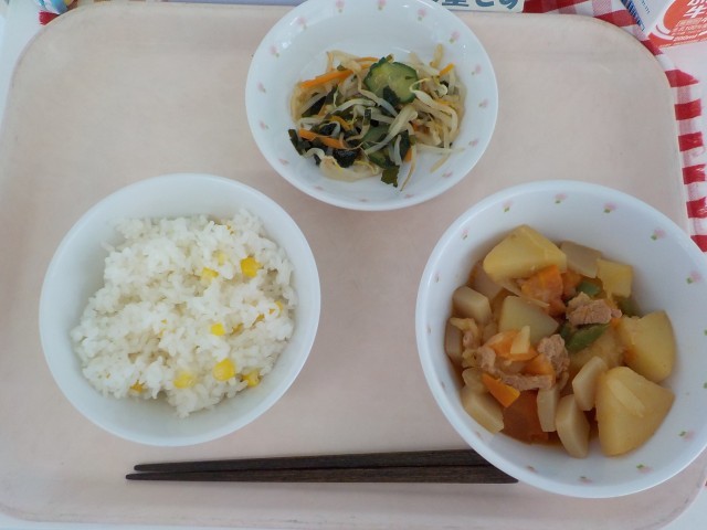 本日の給食は、とうもろこしごはん・トマト肉じゃが・もやしのサラダ・牛乳です。