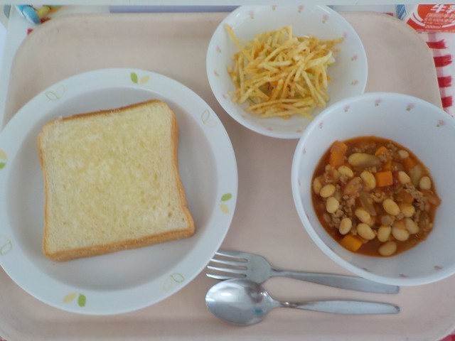 本日の給食は、シュガートースト・チリコンカン・じゃがいものハニーサラダ・牛乳です。