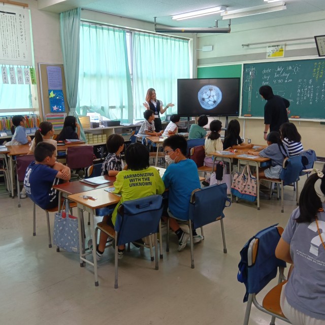4年生の外国語活動です。ネイティブな英語を話すALTの講師の方の英語聞いて発音していきます。