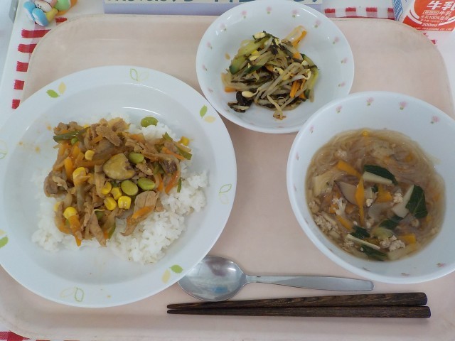 本日の給食は、夏野菜の豚キムチ丼・春雨スープ・豆もやしとのりのサラダ・牛乳です。