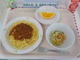 本日の給食は、スパゲッティソイミートソース・オニオンドレッシングサラダ・ネーブル...
