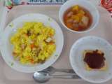 本日の給食は、パエリア・スペイン風オムレツ・サングリア風フルーツポンチ・牛乳です...
