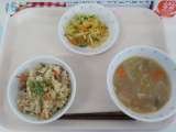 本日の給食は、五目ごはん・糸寒天サラダ・豚汁・牛乳です。