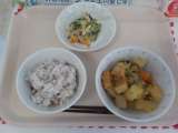 本日の給食は、かりかりゆかりごはん・いりどりに・ちくわ入り野菜のごま酢あえ・牛乳...