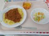 本日の給食は、スパゲッティミートソース・コールスロー・かぼちゃのケーキ・牛乳です...