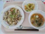 本日の給食は、豆いりひじきごはん・糸寒天サラダ・お月見団子汁・牛乳です。