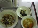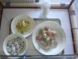 今日の献立は、わかめごはん、牛乳、鶏肉と里芋のうま煮、野菜のからしじょうゆです。