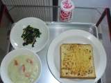 今日の献立は、ガーリックトースト、ジョア(セレクト)、クリームシチュー、ほうれん...