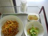 今日の献立は、スパゲッティミートソース、牛乳、コーンサラダ、チーズケーキです。