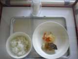 今日の献立は、ごはん、牛乳、魚のピリ辛ソースかけ、シャキシャキ野菜です。