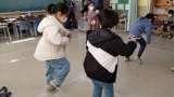 今朝は、集会委員会が計画したポール送りゲームを行います。