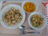 本日の給食は、ガパオ風ライス・はるさめサラダ・フルーツポンチ・牛乳です。 食材...