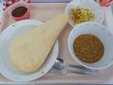 本日の給食は、ナン・キーマカレー・たまねぎドレッシングサラダ・ショコラケーキ・牛...