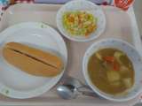 本日の給食は、いちごジャムパン・カレーシチュー・コーンいりサラダ・牛乳です。